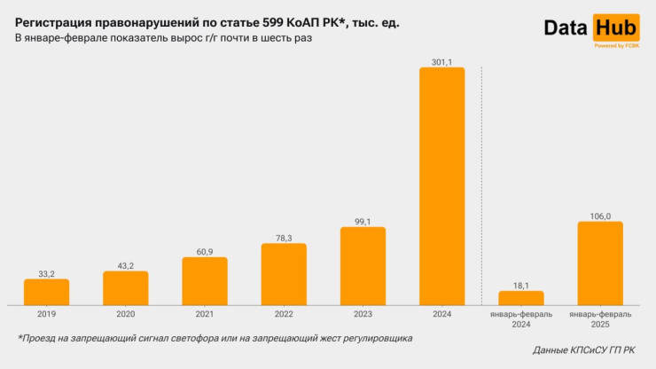 Қазақстанда 2025 жылдың алғашқы екі айында бағдаршамның тыйым салынған түсіне өту бойынша 106 мың құқық бұзушылық тіркелді. Бұл көрсеткіш 2024 жылдың сәйкес кезеңімен салыстырғанда алты есе көп,- деп хабарлайды Tengrinews.kz тілшісі.
