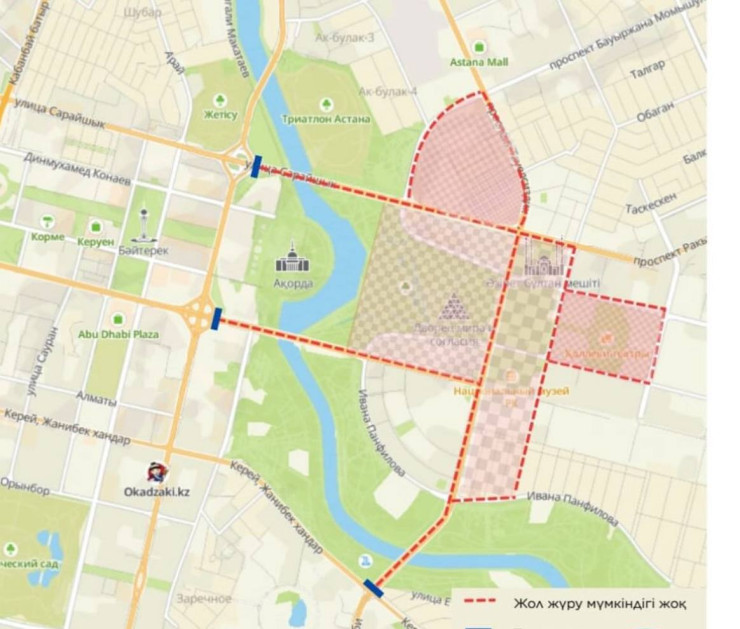 Қосымша,сағат 5:00-ден 13:00-ге дейін Тәуелсіздік даңғылы (Момышұлынан Панфиловқа дейін) жабылады,сондай-ақ Ақыртас,Қалдаяқов көшелерінде және Қошқарбаев даңғылында көлік қозғалысы шектеледі – техника уақытша орналастырылады.