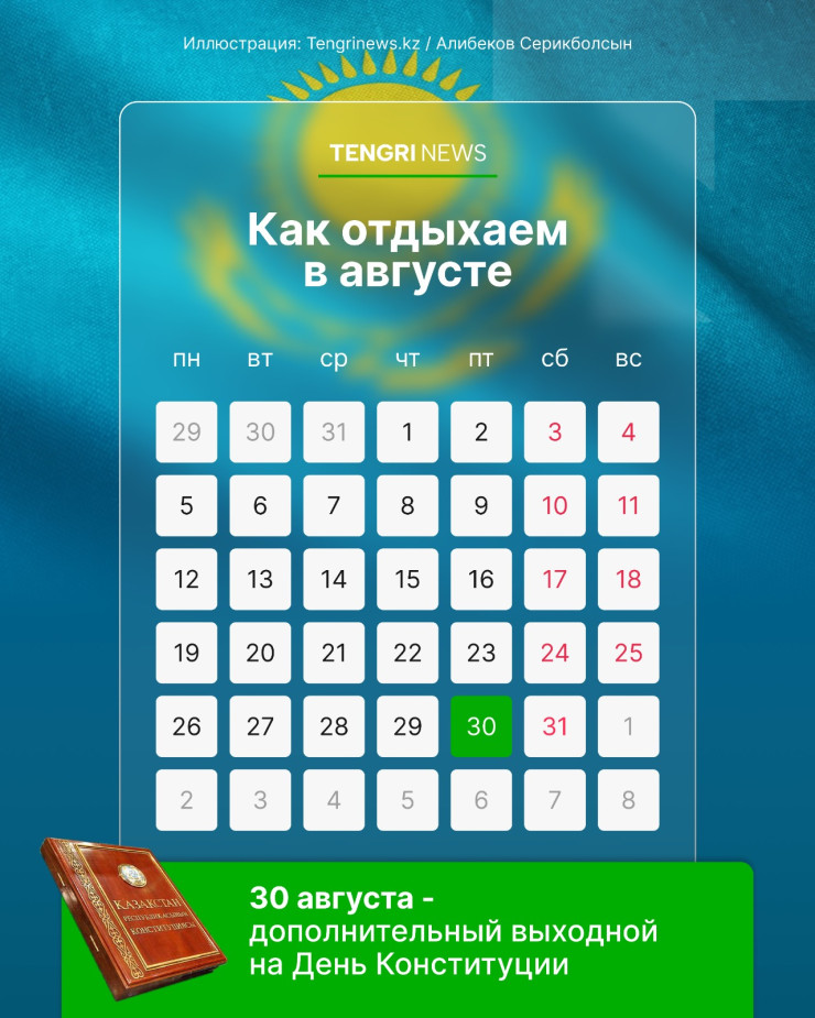 Қазақстандықтар жыл сайын 30 тамызда атап өтілетін Конституция күніне орай қосымша бір күн демалады. Биыл мереке жұмаға сәйкес келетіндіктен,бес күн жұмыс істейтін тұрғындар 30 тамыз бен 1 қыркүйек аралығында демалыста болады.