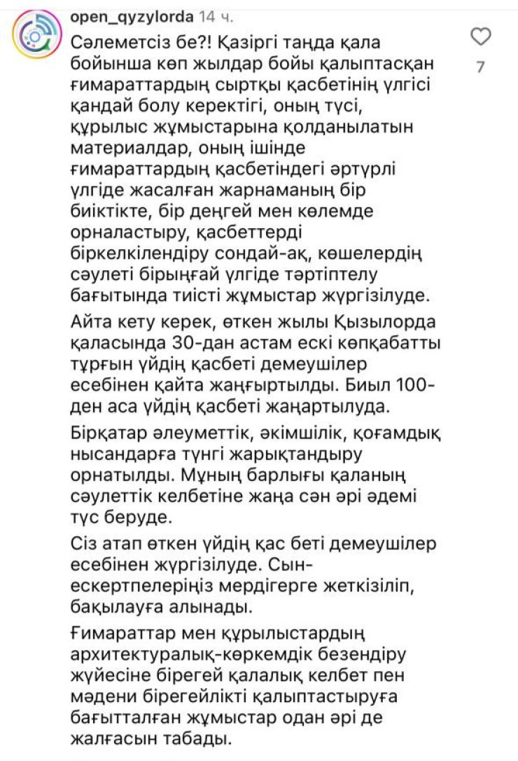 "Қала бойынша облыс орталығына бірыңғай сәулеттік көрініс беру бойынша тиісті жұмыстар жүргізіліп жатыр. Сонымен қатар,ғимараттардың сыртқы қасбеті қандай болуы керегіне,олардың түсі,құрылыс жұмыстарына қолданылатын материалдар,соның ішінде әр түрлі формадағы ғимараттардың қасбетіне жарнама орналастыру (олар бір биіктікте,бір деңгейде болуы керек) және т. б. постта көрсетілген үйді жөндеу демеушілердің есебінен жүзеге асырылады. Барлық сын-ескертпелер мердігерге жеткізіліп,бақылауға алынады",- деп жазды әкімдік қызметкерлері.