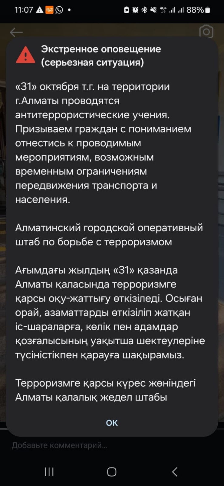 Алматылықтардың телефонына сағат 11:05-те оқу-жаттығу өткізілетіні туралы сигнал түсті. Android операциялық жүйесі бар телефондарда дыбыстық сигнал ойнап,экранда хабарлама пайда болды.