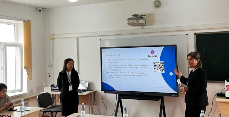 Екінші шеберлік сынып "Жасанды интеллект көмегімен қазақ және ағылшын тілі пәндерін оқытуды оңтайландыру" тақырыбында қазақ тілі мен әдебиеті пәні мұғалімі,педагог-шебер,Мусаева Мирамкүл мен ағылшын тілі мұғалімі педагог-зерттеуші,Заитова Гаухардың шеберлік сыныбында "Gamma","D-ID","Padlet","DiFfit","EDUCAPLAY" платформаларының сабақта тиімділігін таныстырды және тәжірибе алмасты.