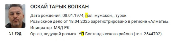 Тарык Волкан Оскайды іздеу туралы ақпарат құқықтық статистика және арнайы есепке алу порталында пайда болды. Бұл іс 18 сәуірде Алматыда тіркелген,Ішкі істер министрлігі іздеу жұмыстарын бастаған.