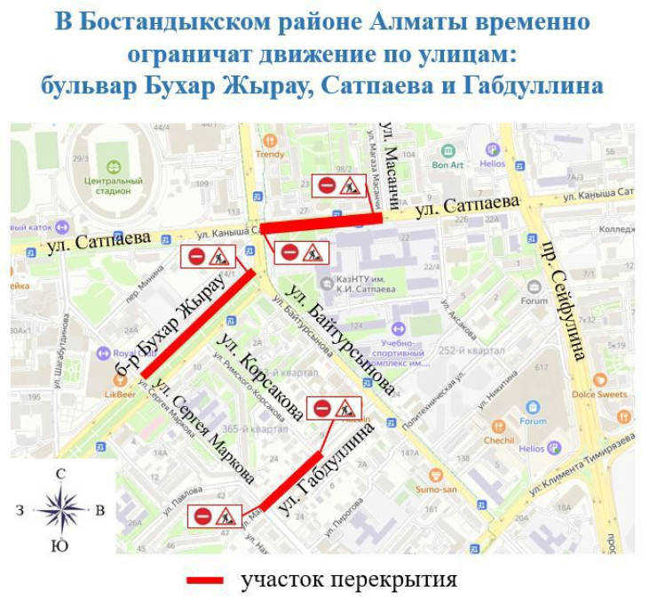 1 маусымнан бастап 20 тамызға дейін Сәтпаев көшесімен Масанчи көшесінен бастап Байтұрсынов көшесіне дейін екі бағытта қозғалыс шектеледі.