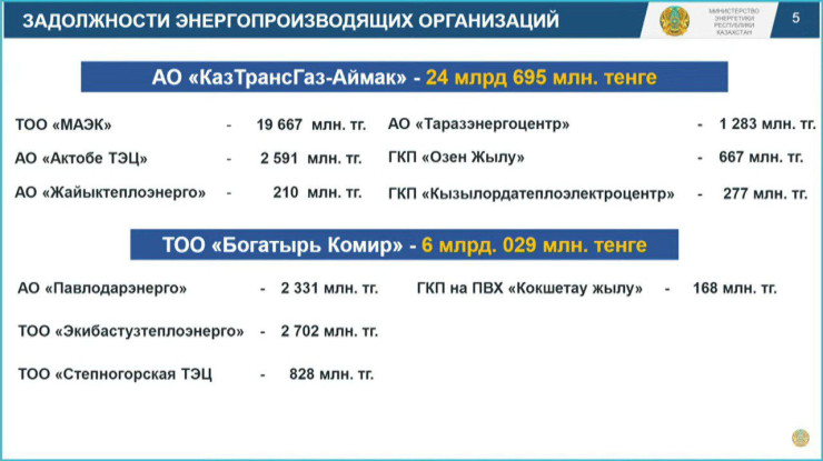 "Энергия өндіруші ұйымдардың "ҚазТрансГаз-Аймақ" АҚ алдындағы берешегі 24 миллиард 695 миллион теңге болады. Сондай-ақ,энергия өндіруші ұйымдардың "Богатырь-Көмір" ЖШС алдында 6 миллиард 029 миллион теңге сомасында берешегі бар. Энергия кәсіпорындары бойынша берешек слайдта көрсетілген. Энергия кәсіпорындары берешекті өтеуді жеделдетуі қажет",- деді Алмасадам Сәтқалиев.
