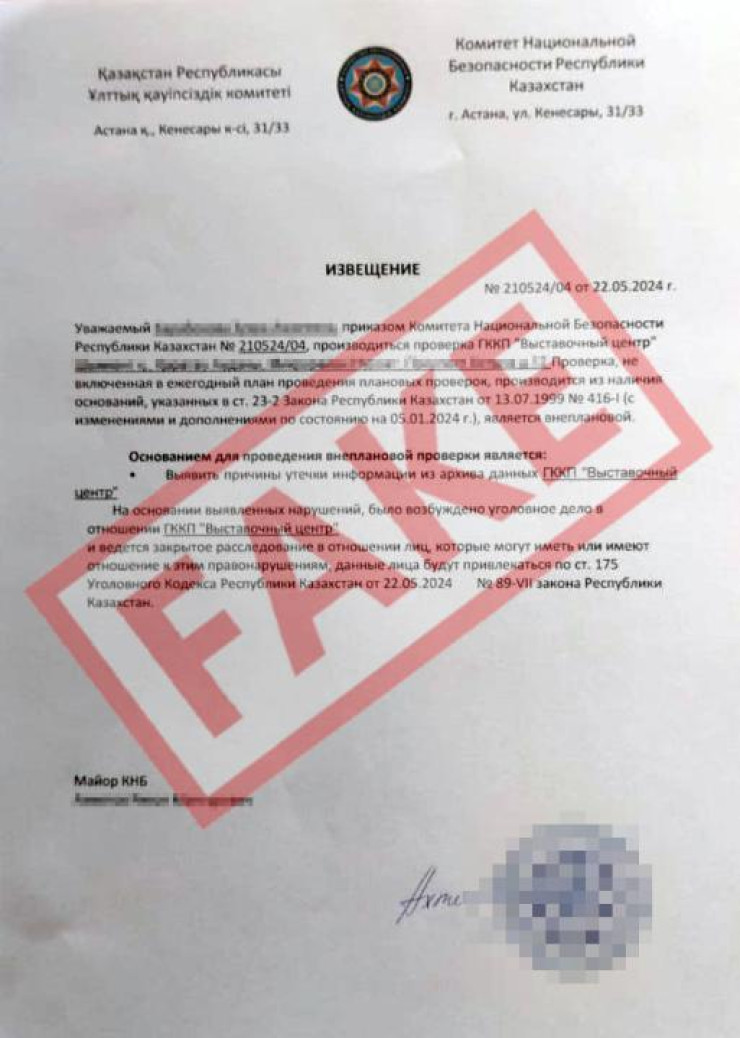 Қазіргі уақытта алаяқтық әрекет деректері жиілеп кеткен. Қаскөйлер күштік құрылымдар,соның ішінде Ұлттық қауіпсіздік комитеті басшыларының атынан азаматтарға хат жолдауға көшкен.