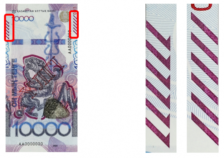 Банкноттың беткі бетінің шетінде шығыңқы,жоғары рельефті элементтер бар. Олар қолмен ұстағанда жақсы сезілетін – көру қабілеті нашар адамдарға арналған белгі.