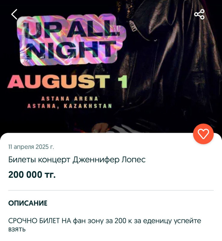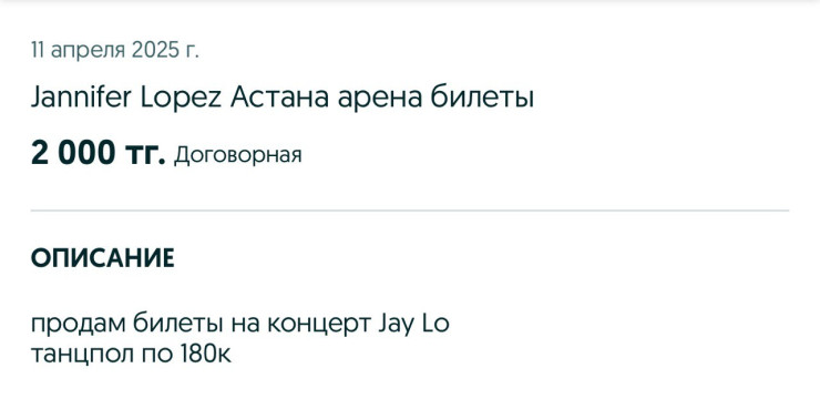 Америкалық супержұлдыз Дженнифер Лопестің Астанада өтетін концертіне билеттер санаулы сағатта сатылып кетті. Алайда бір күн өтпестен сайттарда "тиімді" ұсыныстар жасалған хабарландырулар пайда болды. Бұл жағдай әлеуметтік желіде қызу талқыланып жатыр,- деп хабарлайды Tengrinews.kz тілшісі.
