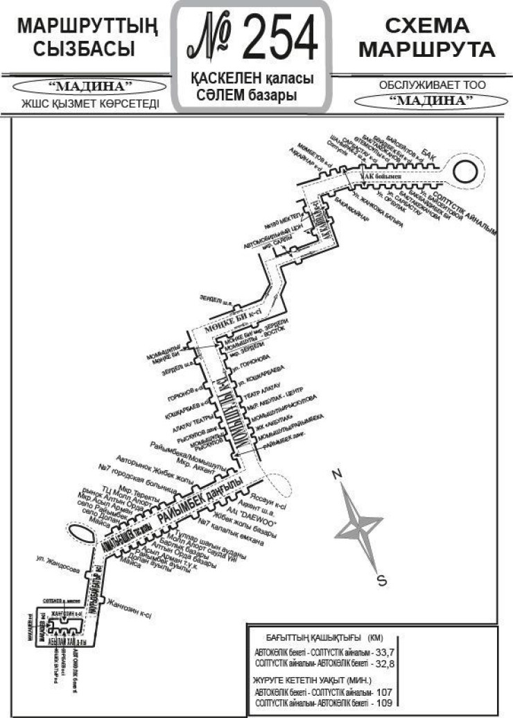 №254 маршрут: Қаскелең – "Сәлем" базары,16 автобус,қозғалыс уақыты: 5:50 - 23:00.