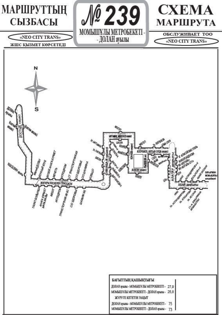 №239 маршрут: "Б.Момышұлы" метро бекеті – Долан ауылы,18 автобус,қозғалыс уақыты: 5:30 - 23:01.