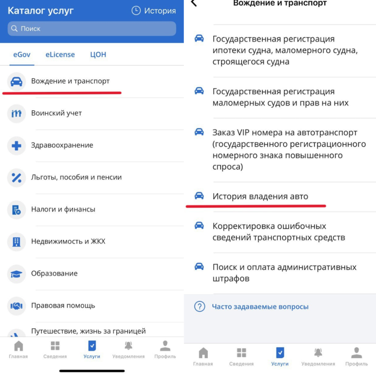 Бұл қызметті пайдалану үшін eGov Mobile қосымшасын ашып,"Қызметтер" бөліміне өту керек,одан кейін "Жүргізу және көлік" және "Автокөлік иелену тарихы" бөлімін таңдау қажет.