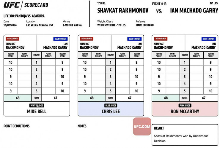 Қазақстандық аралас жекпе-жек шебері Шавкат Рахмонов Лас-Вегаста өтіп жатқан UFC 310 турнирінде ирландиялық Иан Гэрриді жеңіп шықты,- деп хабарлайды Tengrinews.kz тілшісі.
