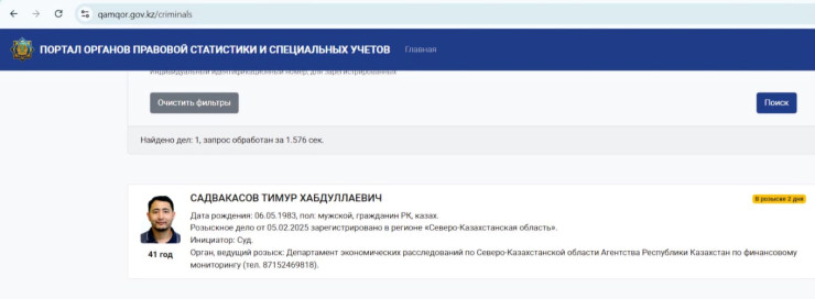 Іс Солтүстік Қазақстан облысында тіркелген. Іздеуді Қаржы мониторинг агенттігінің Солтүстік Қазақстан облысы бойынша Экономикалық тергеу департаменті жүргізеді.