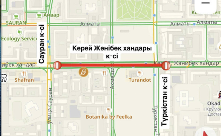 Сонымен қатар,30 маусым мен 6 шілде аралығында Керей-Жәнібек хандар көшесінің Түркістан көшесінен Сауран көшесіне дейінгі бөлігінде орташа жөндеу жұмыстарына байланысты қозғалыс жартылай шектеледі. Мұнда да көліктердің жүрісі екі бағытта кезеңмен бір жақ бетпен қамтамасыз етіледі.