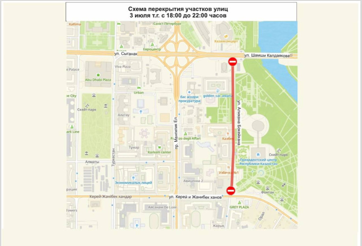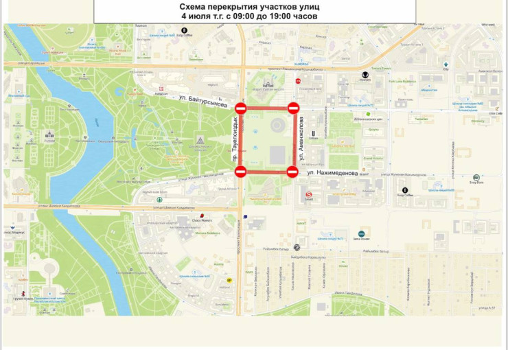 4 шілдеде сағат 09.00-ден 19.00-ге дейін Нәжімеденов көшесі бойынша Тәуелсіздік даңғылынан Аманжолов көшесіне дейін,одан әрі Аманжолов көшесінен Байтұрсынов көшесіне дейін және Байтұрсынов көшесінен Тәуелсіздік даңғылына дейін.