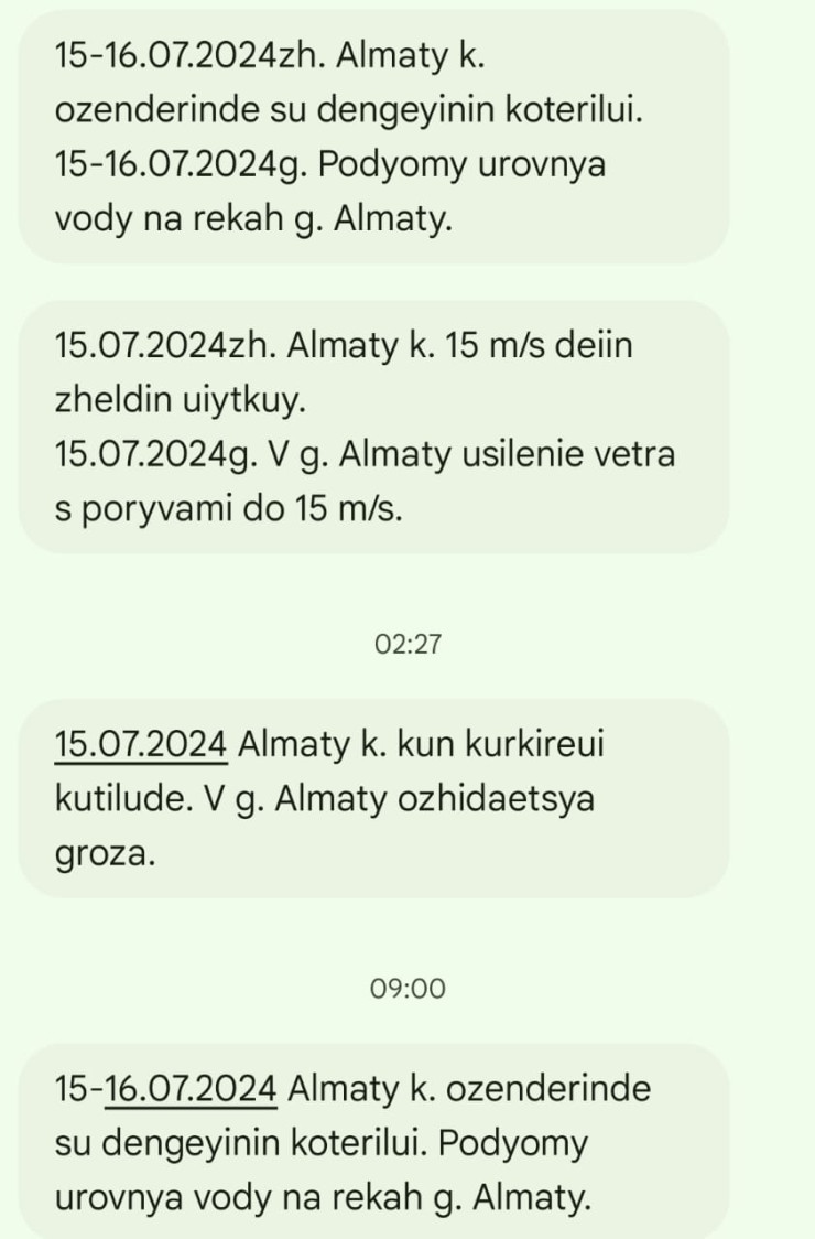 Қала тұрғындары 112 қызметінен 15-16 шілдеде Алматы өзендерінде су деңгейі көтерілетіні туралы SMS-хабарлама алды.
