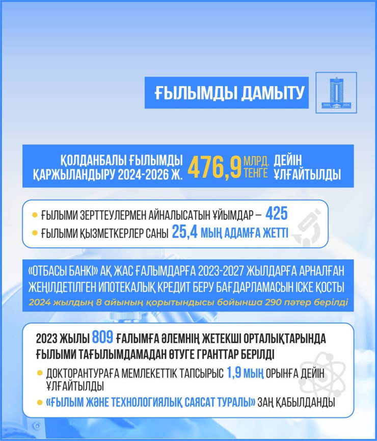 Қолданбалы ғылымды мемлекеттік қаржыландыру 2024-2026 жылдарға 476,9 миллиард теңгеге дейін ұлғайтылды (оның ішінде бағдарламалық-нысаналы қаржыландыру – 211 миллиард теңге,гранттық қаржыландыру – 198 миллиард теңге,коммерцияландыруды гранттық қаржыландыру – 67,9 миллиард теңге).