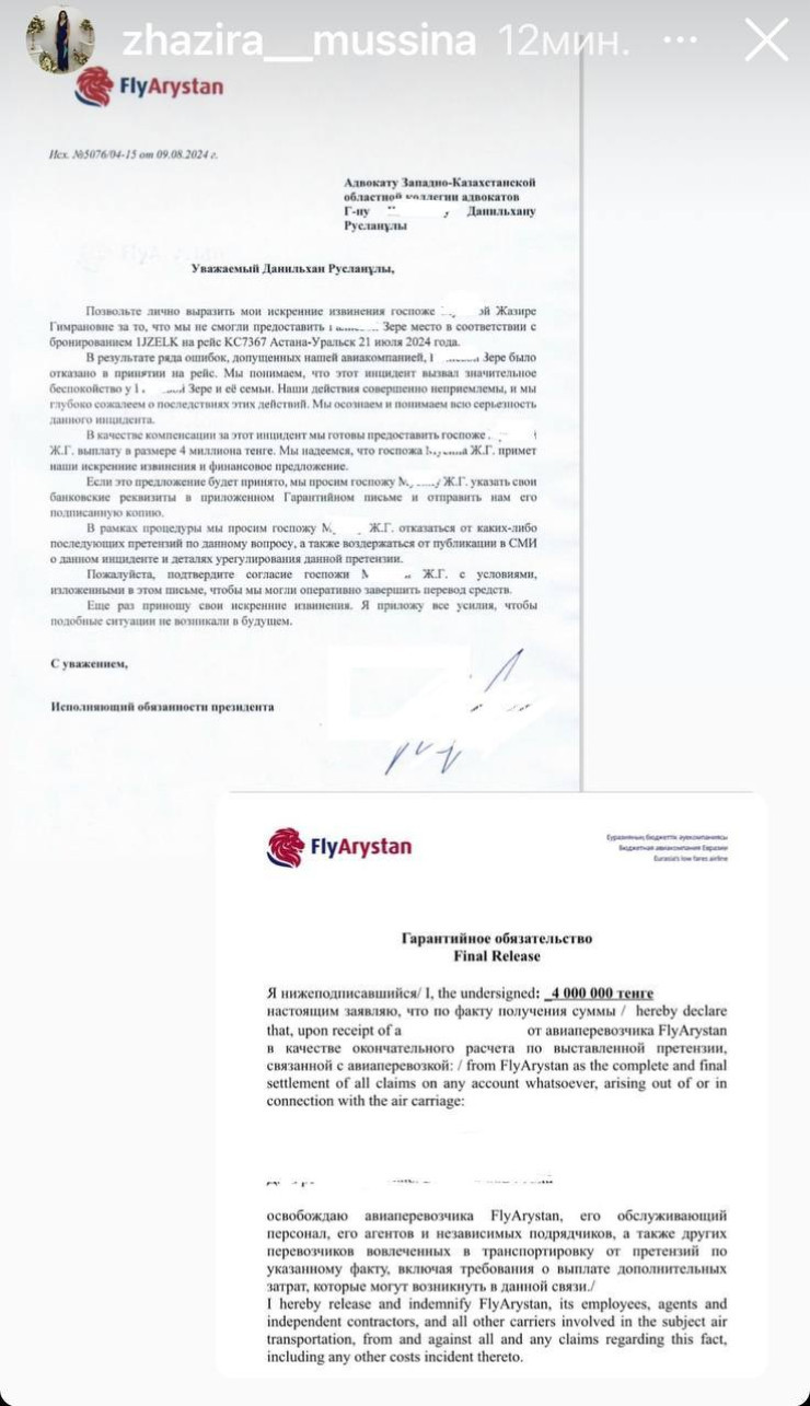 Жазира Instagram парақшасында FlyArystan әуекомпаниясынан қоңырау шалғанын жазды.