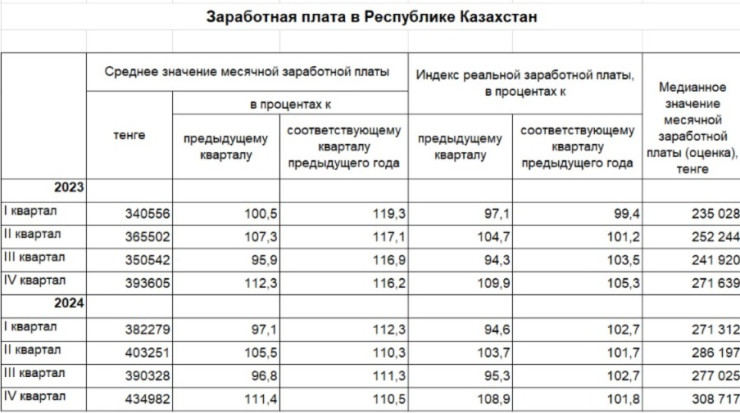Бюро мәліметінше,2024 жылғы IV тоқсанда Қазақстанда медианалық жалақы 308 717 теңге,ал орташа жалақы 434 982 теңге болған. Айта кетейік,2024 жылы III тоқсанда Қазақстанда медианалық жалақы 269 378 теңге,ал орташа жалақы 390 328 теңге болды.