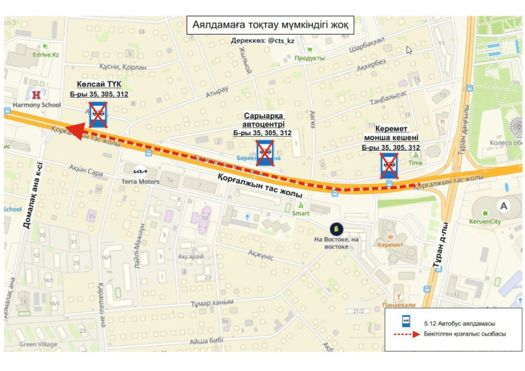 № 35,305,312 маршруттары Қорғалжын тасжолы бойындағы "Керемет" монша кешені,"Көлсай" ТК және "Сарыарқа" Автоорталығы" аялдама пункттеріне уақытша тоқтамайды.