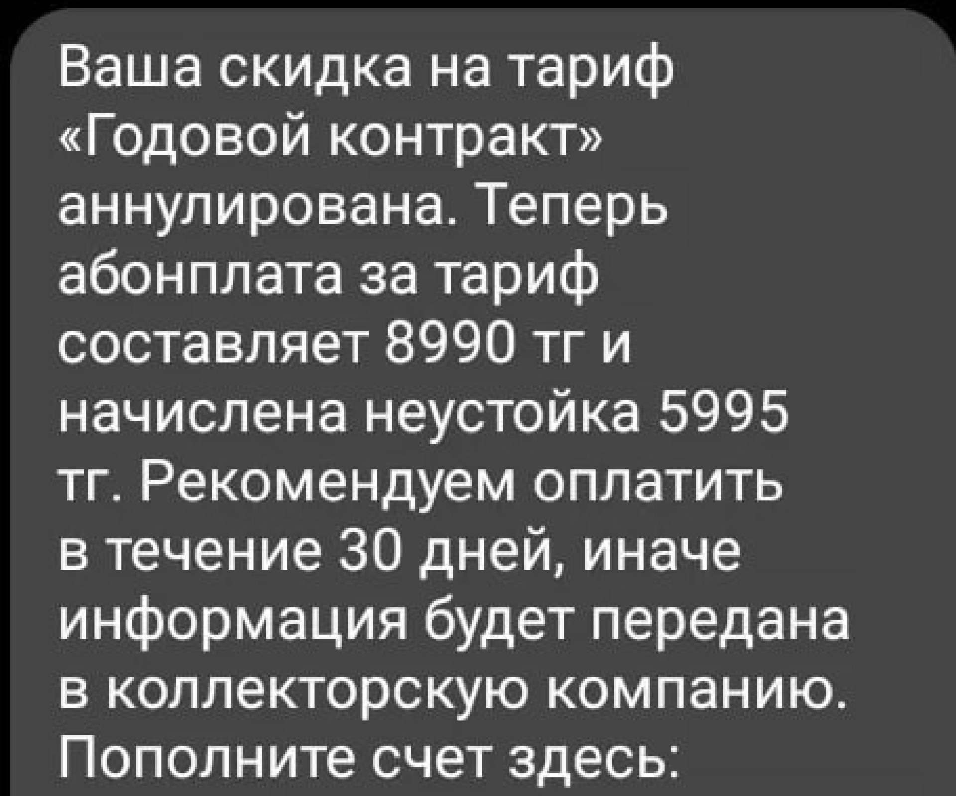 Айта кетейік,жазба астындағы пікірлерде тағы бір қолданушы осыған ұқсас жағдай туралы айтып,оператордан келген SMS-хабарламаның скриншотын тіркеген. Онда қарызды өндіріп алумен коллекторлар айналысуы мүмкін екені жазылғаны назар аудартады.