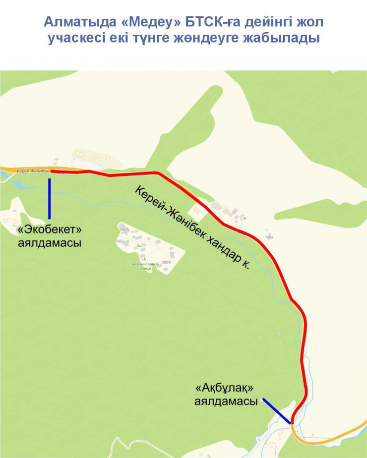 "28 тамыз сағат 06:00-ге дейін қозғалыс "Ақбұлақ" бұлағынан селден қорғау құрылымдары мен "Экопост" аялдамасына дейінгі учаскеде жабылады. Жабылатын учаскенің ұзындығы - 2,4 шақырым. Осы көшенің тағы 2 шақырымын жөндеу жоспарланған. Кейін жабылатын жол учаскелерінің күндері мен уақыты туралы қосымша хабарланады",- деп жазылған хабарламада.