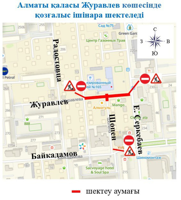 20 қыркүйекте сағат 06:00 бастап,30 қыркүйек сағат 06:00-ге дейін Алматының Бостандық ауданында Журавлев көшесінің бойымен Серкебаев даңғылынан бастап Сеченов көшесіне дейін автокөліктердің қозғалысы шектеледі. Қозғалыс екі жаққа да жабылады.
