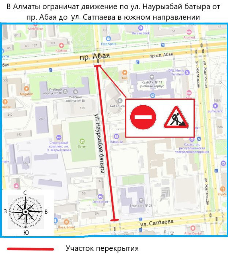 3 маусымда сағат 23:00-ден бастап 4 маусым сағат 08:00-ге дейін Алматының Бостандық ауданына қарасты Наурызбай көшесінің бойында Абай даңғылынан Сәтпаев көшесіне дейін автокөліктердің қозғалысы жартылай шектеледі.